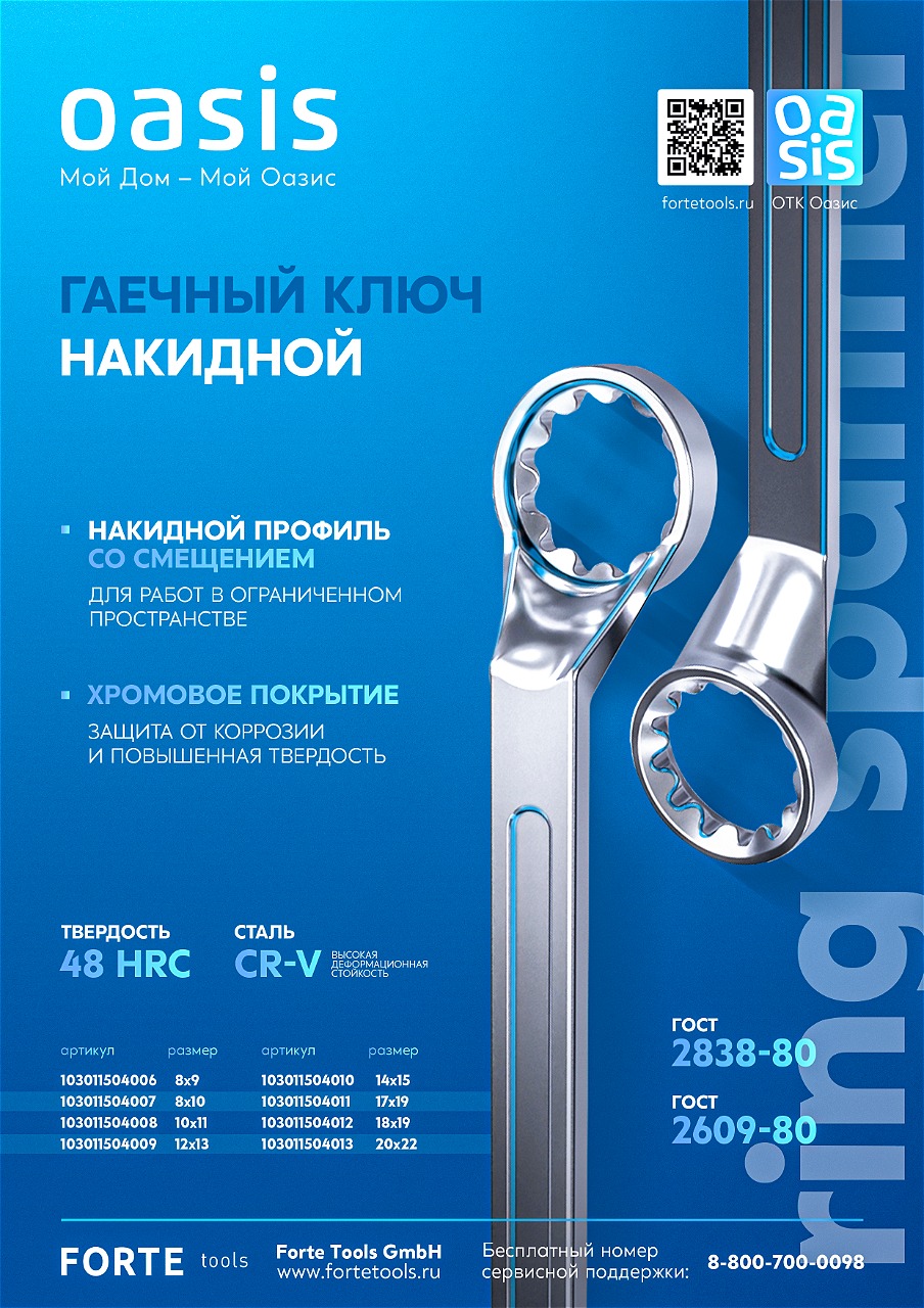 Накидной гаечный ключ Oasis – профессиональный инструмент для надёжного монтажа крепежей. Профиль со смещением позволяет работать в труднодоступных местах, оберегая от травм при работе в стесненных условиях моторных отсеков или за коммуникациями.